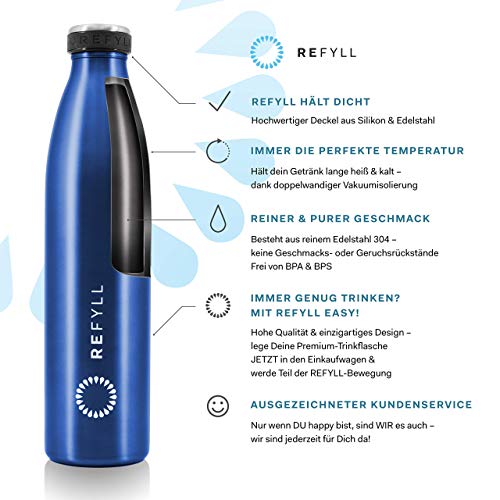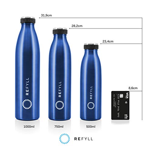 REFYLL Bottiglia d'acqua in acciaio inossidabile "dailyFYLL" - 500 ml, 750 ml, 1 l - Termosigillante con isolamento sottovuoto a doppia parete - Bottiglia isolante per sport, scuola (blu, 1000 ml)