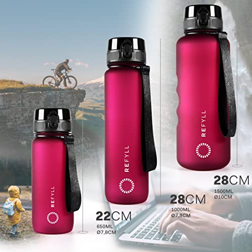 A PROVA DI PERDITE E SOSTENIBILE: Dimentica le perdite con la nostra affidabile bottiglia d'acqua da 1L. La bottiglia fitness REFYLL è 100% a prova di perdite e perfetta per le bevande gassate. Scegli tra quattro colori e tre dimensioni (1.5L, 1L o 650ML).