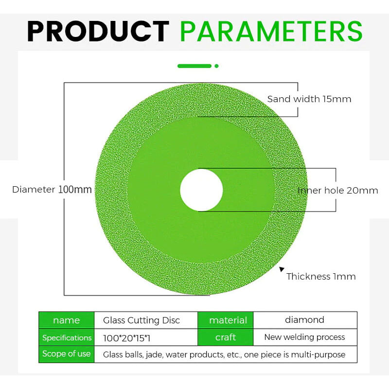 Caratteristiche: 1. Materiale avanzato: Utilizzo del diamante, nuovo processo di brasatura, rondelle aggiornate e aggiornate, più convenienti, più sicure e più durevoli. 2. Taglio più veloce e preciso: I dischi da taglio diamantati sono resistenti alle alte temperature per ridurre le vibrazioni e un taglio più rettilineo e veloce. È affilato e non si piega, un pezzo è multiuso, la fessura è piccola ed è resistente al taglio e all'usura. 3. Taglio senza trucioli: I dischi per sega ultrasottili da 1 mm non danneggiano la superficie degli oggetti, la forza di macinazione è uniforme e la levigatezza è buona. Con basso rumore di macinazione e meno polvere, depositi minimi e un taglio di prima classe 4. Facile da gestire: Progettata per l'uso con la smerigliatrice angolare modello 100, è facile da installare e utilizzare e può resistere alle esigenze del taglio a secco/a umido e del taglio lungo e continuo. 5. Ampia applicazione: Per tagliare, smussare e levigare vetro, giada, cristallo