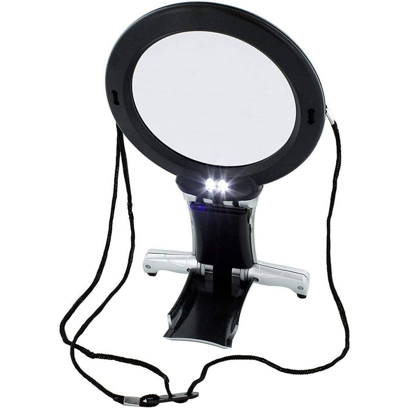 Lente d'ingrandimento da collo e da tavolo ARSUK con 2 LED integrati e interruttore on/off. Ideale per esaminare piccoli testi, immagini, giornali, istruzioni farmaceutiche, ecc. La lente ottica sarà di grande utilità per punto croce, cucito, ricamo, lettura di libri, artigianato, saldatura, hobby o piccole riparazioni progetti. I 2 LED luminosi forniscono un'illuminazione ottimale per lavorare efficacemente al buio o alla luce del giorno. Fornisce un ambiente luminoso stabile e continuo. Richiede 3 batterie AAA. (non inclusa nella confezione). La nostra lente d'ingrandimento ha una speciale lente per primi piani con ingrandimento 6x. Il campo visivo delle nostre lenti di ingrandimento in vetro è ampio e chiaro. L'inclinazione della testa della lente d'ingrandimento può essere regolata a piacimento. Questa lente d'ingrandimento non solo può essere appesa al collo, ma può anche essere aperta su un tavolo grazie al supporto integrato. Appesa al collo, questa lente d'ingrandimento a mani