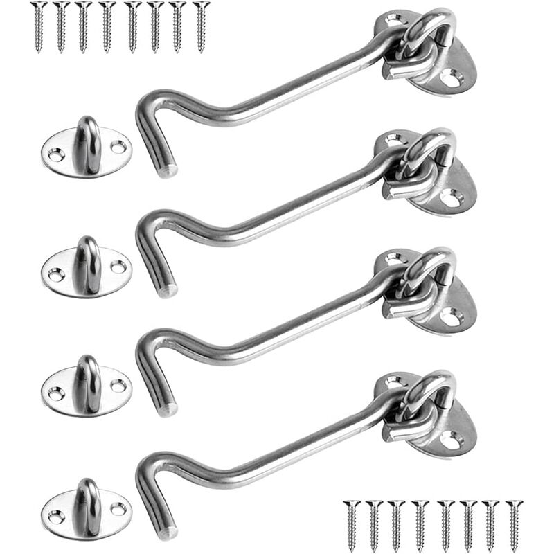 Combinazione - Chiusura porta con 4 ganci (inclusi golfari), 16 × viti. Ogni vite ha quattro viti lunghe 18 mm, la lunghezza del gancio è 108 mm, il diametro è 6 mm, la dimensione del blocco dell'occhio è 20 x 40 mm e lo spessore è 2 mm. L'intera attrezzatura è molto comoda, quindi puoi installarla in luoghi diversi in base alle tue esigenze. 【Materiale】 La porta di chiusura è realizzata in acciaio inossidabile di alta qualità, resistente senza ruggine, piegatura o scolorimento. È abbastanza forte da bloccare e tenere le finestre. Ha la massima resistenza alla corrosione e durata, fornendo ulteriore sicurezza nei prossimi anni! 【Facile da installare】 Il gancio del fermo della porta è facile da installare, ogni fermo viene fornito con 4 viti, senza bisogno di particolari abilità e strumenti, basta trapanare le viti nel foro e fissare la piastra ad occhiello per completare il lavoro. 【Ampiamente usato】 Questi ganci di chiusura delle porte possono essere applicati per recinzioni in