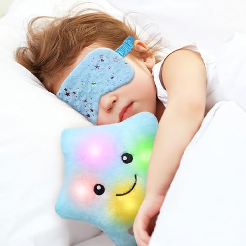 Regali per Dormire per Ragazze - il nostro set regalo di peluche, morbido e carino, molto comodo da toccare. Cuscino in peluche scintillante a forma di stella a cinque punte con una faccia sorridente, e come luce notturna nella notte oscura, fai sentire i bambini al sicuro, indossa la fascia a stella e tuffati rapidamente nel dolce sogno. Lascia che i bambini sviluppino gradualmente l'abitudine di dormire da soli.