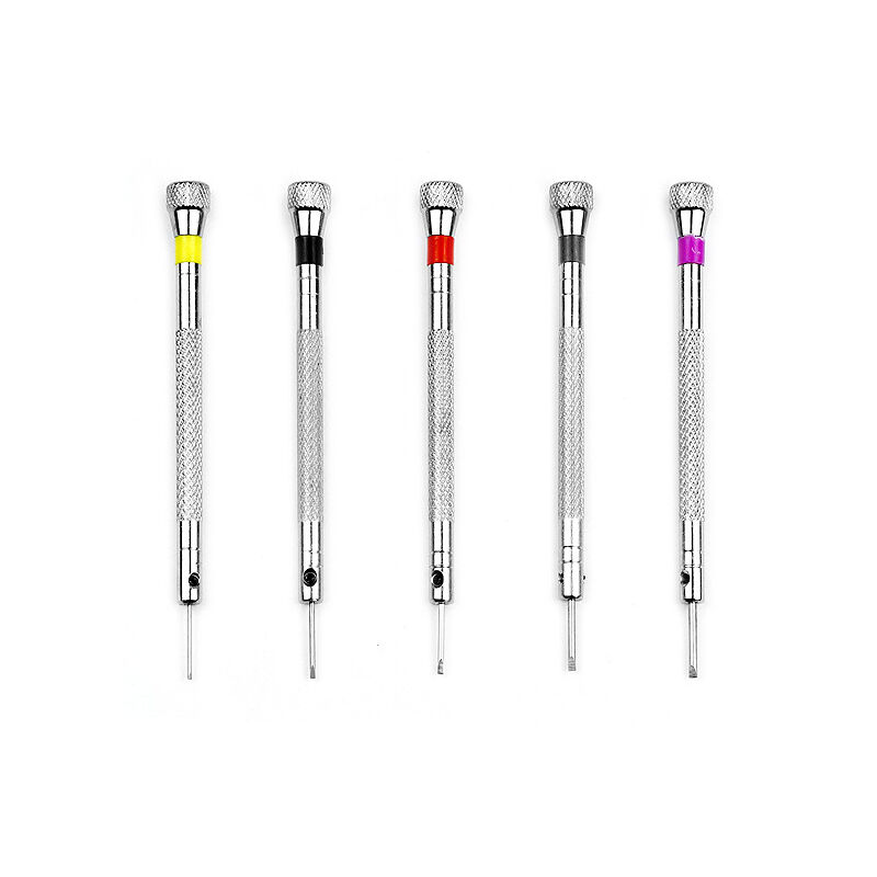 Set di cacciaviti piatti di precisione in 5 pezzi con cappucci spinner Cacciavite di dimensioni coordinate a colori 0,80 mm, 1,00 mm, 1,20 mm, 1,40 mm e 1,60 mm Pratico set per la riparazione di orologi, sostituzione della batteria dell'orologio, rimozione dei collegamenti a vite del cinturino dell'orologio, riparazione di occhiali, gioielli e riparazione di componenti elettronici Manico antiscivolo con borchie, è possibile forzare i cappucci degli spinner ruotandoli