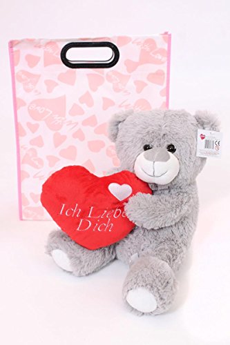 Include: 1 orso grigio con un cuore rosso con la scritta "Ich liebe Dich" ricamata su di esso + 1 sacchetto regalo con cuore adorato
