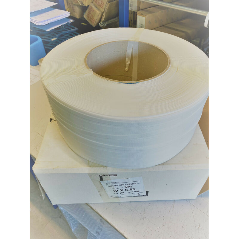 Riciclabile al 100%, totalmente smaltibile, economica e pratica, zigrinata, raggiunge livelli di massima tenacità e affidabilità. Colore Bianco. Misure: Bobina 2500 mt. Larghezza reggetta 12 mm Spessore reggetta 0,65 mm Foro interno rotolo da 20 cm