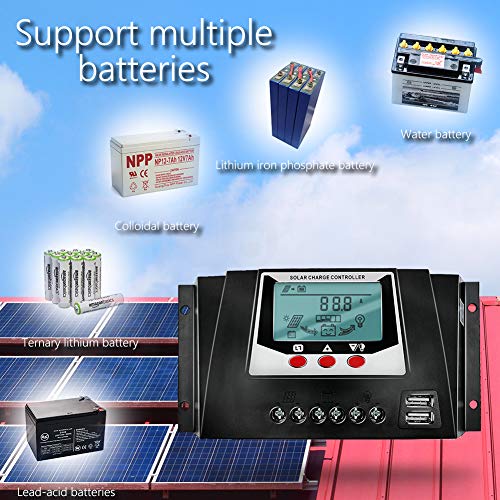Potente regolatore di carica solare 40A: il nostro affidabile ed efficiente regolatore di carica PWM da 40 A Supporta batteria al piombo e batteria al litio Carica e scarica, inoltre può funzionare dal pannello solare quando la tensione della batteria al litio è 0 (zero) V, 12V 24V Auto per realizzare il massimo utilizzo di energia solare