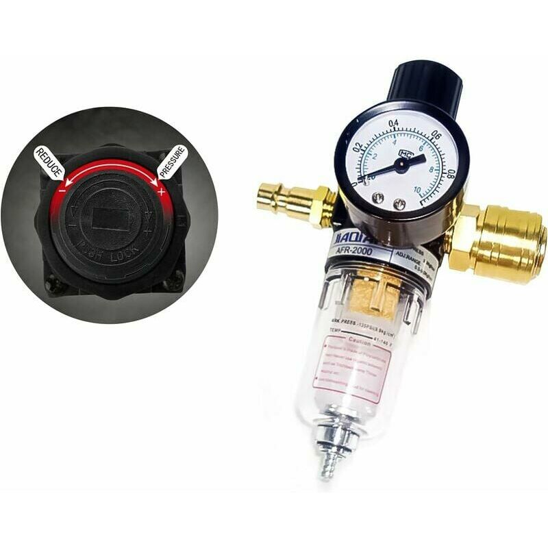 Caratteristiche del filtro - : per abbassare o mantenere la pressione dell'aria. Il dispositivo di mantenimento della pressione dell'aria esegue la compressione del vuoto iniettando aria per rimuovere efficacemente impurità, umidità e sostanze inquinanti nelle apparecchiature pneumatiche. 【Composizione】: la coppa del filtro è trasparente, consentendo di controllare accuratamente e rapidamente l'acqua e condizioni dell'olio. L'elemento filtrante è realizzato con materiali di alta qualità, resistente alla forte corrosione e ha una lunga durata. Allo stesso tempo, è possibile osservare la pressione del manometro controllando la manopola della pressione. 【Facile da usare e installare】: il separatore olio-acqua può controllare e regolare efficacemente il quadrante della pressione per fornire aria pulita, asciutta e priva di impurità, assicurando che l'apparecchiatura di compressione non sia inquinata. Allo stesso tempo, è leggero, portatile, veloce da installare e mantenere. 【Ambito di