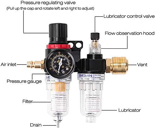 SEPARATORE OLIO ARIA COMPRESSA E SEPARATORE ACQUA - Il regolatore dell'aria compressa mantiene costante la pressione di esercizio, l'aria compressa che scorre viene prima pulita dallo sporco e dalla condensa e poi miscelata con un olio regolabile. Il riduttore di pressione del filtro protegge i dispositivi ad aria compressa dalla contaminazione meccanica e dall'acqua. Il regolatore di pressione per un'erogazione uniforme dell'aria e un funzionamento delicato del compressore.
