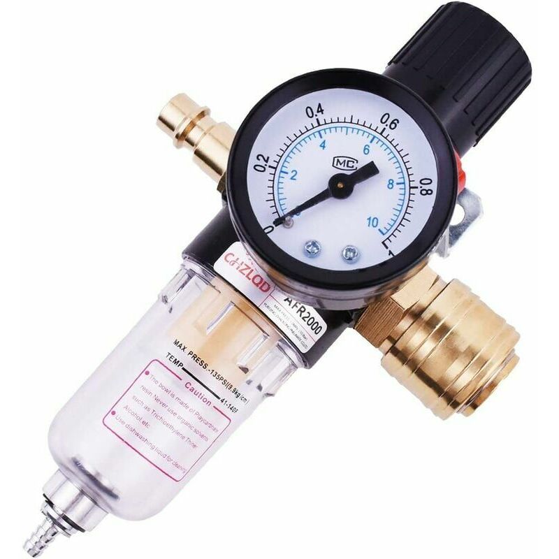 Prevent compressore efficace: incluso un filtro antiparticolato e un separatore d'acqua con scarico semiautomatico. Unità di manutenzione di alta qualità: la regolazione del filo e la regolazione sono realizzate in ottone, acciaio aderente e acciaio inossidabile. Affidabile e durevole. Facile da installare e mantenere: basta collegare il regolatore dell'aria compressa tra il compressore e l'utenza, tirare la manopola nera e impostare la pressione desiderata. Facile da installare e mantenere. Risparmio del misuratore di pressione per materiali di misurazione della pressione: campo di impostazione della pressione: 0,05 - 0,85 MPa, pressione massima di impostazione: 0,95 MPa. Intervallo temperatura di esercizio: 5 - 60°C. Capacità tazza filtro acqua: 60 cc. Come funziona: protegge efficacemente il sistema di aria compressa dalla contaminazione meccanica e dall'acqua e mantiene la pressione di esercizio. Il riduttore di pressione consente un'evacuazione regolare dell'aria e un