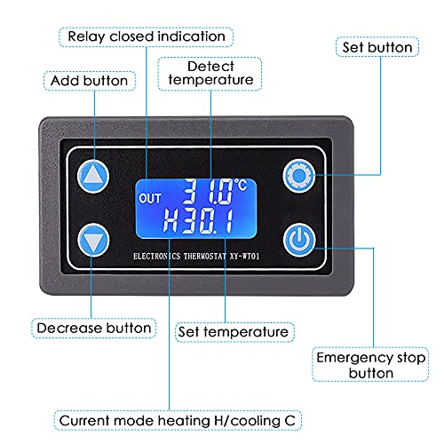 ✔️Multifunzione - Questo termoregolatore digitale è multifunzione, supporta la memoria di spegnimento, l'arresto di emergenza, la visualizzazione della temperatura in tempo reale, il salvataggio automatico dei parametri, l'impostazione UART, il riscaldamento e il raffreddamento, l'allarme per alta temperatura e la visualizzazione dello stato di funzionamento.