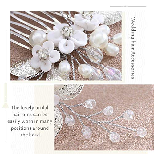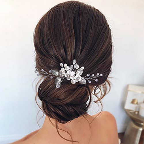Relandy Pettine per capelli da sposa con fiore per capelli da sposa, con foglie e perle, accessori per capelli da sposa (argento)