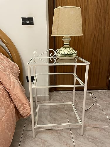 Comodino in ferro battuto con tre ripiani in vetro, colore nero grafite o bianco, dimensioni cm: L.43 P.35 H.65