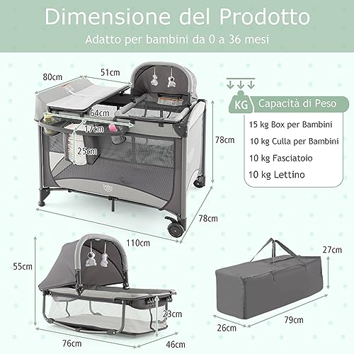 RELAX4LIFE 5-in-1 Lettino da Campeggio per Bambini, Culla Neonato Fianco Letto, Lettino Neonato con Materasso, Ruote Bloccabili e Borsa per il Trasporto, per Bambini 0-36 Mesi (Grigio)