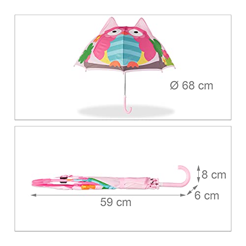 Relaxdays 10022286_769 Ombrello per Bambini con Gufo 3D, Parapioggia per Bimba e Bimbo, Piccolo Bastone Ombrellino da 14 Anni