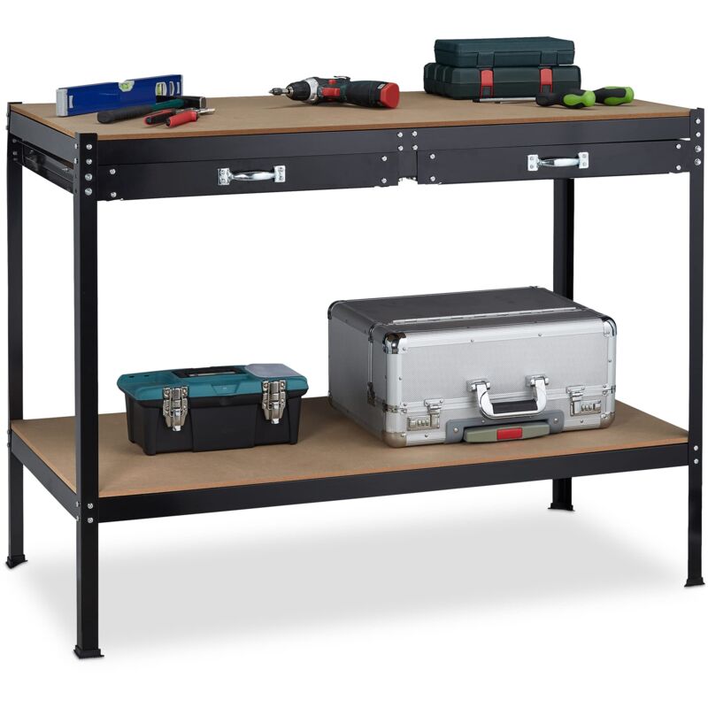 Con questo pratico banco da officina potrai finalmente dare un posto a tutti i tuoi attrezzi e avere un 'ampia superficie dove dedicarti ai tuoi progetti fai da te e di artigianato. Gli accessori più piccoli possono essere riposti nei 2 grandi cassetti. Gli oggetti ingombranti e pesanti possono invece essere riposti sul ripiano inferiore. Il bancone è realizzato in acciaio robusto ed è adatto a reggere carichi pesanti, quindi perfetto in garage,cantina o nel capanno degli attrezzi in giardino. Banco da lavoro in dettaglio - Misure complessive H x L x P: 90 x 120 x 60 cm ca. - Capacità di carico: 100 kg ca. - Peso: 19,5 kg ca. - Materiale: acciaio, legno MDF - Colore: nero Banco da lavoro nero capiente - Ripiani L x P: 120 x 60 cm ca. ciascuno - Altezza dello spazio sottostante: 50 cm ca. - Dimensioni interne cassetti H x L x P: 6 x 52 x 40 cm ca. - Distanza dal suolo: 23 cm ca. Tavolo da officina con cassetti - Bancone per poter lavorare da in piedi - Ideale in vari ambienti: cantina