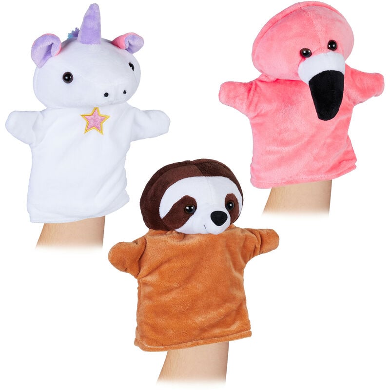 Con questi burattini potrai far immergere i tuoi bambini in vari ruoli. Il bradipo calmo, l'impavido unicorno e l'elegante fenicottero. Metti in scena storie e fiabe con i tuoi amici e inventa ogni ruolo e personaggio possibile. Adorerai le grandi teste con gli occhietti a bottone. Genitori e insegnanti possono organizzare dei fantastici teatri delle marionette con questo set da 3 animali per intrattenere i bambini. Divertimento puro per bambini e adulti. Burattini animali in dettaglio - Altezza degli animali tra 20 e 24 cm ca. - Diametro aperture 8 cm ca. - Larghezza degli animali da braccio a braccio: 20 cm ca. - Spessore della testa: 11 - 13 cm ca. - Peso ogni pupazzo: 50 g ca. - Materiale: poliestere - Colore: multicolore Burattini per giocare e raccontare storie - Pupazzi morbidi con adorabili occhi a bottone - Simpatico gruppo di animaletti da zoo o fantastico - Per teatro delle marionette, gioco di ruolo o per imparare - Con ampio spazio della mano e 2 spazi per inserire le