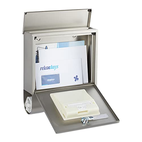 Relaxdays Cassetta della Posta con Illuminazione, con Portariviste, Numero Civico e Targhetta, 33,5x30,5x10 cm, Argento, Acciaio Inossidabile, 1 pz