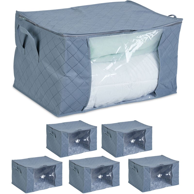 Le custodie sottoletto sono perfette per riporre comodamente vestiti, coperte, biancheria da letto e altro ancora sotto il letto o sopra l'armadio. La robusta cerniera garantisce un facile accesso e protegge efficacemente il contenuto dalla polvere. La finestra trasparente a lato consente di vedere sempre cosa c'è all'interno dell'organizer per la base del letto. Con questi sacchetti salvaspazio, potrai tenere in ordine le lenzuola, gli asciugamani o i vestiti nel cambio stagione. Set da 6 organizzatori sotto letto in dettaglio - Dimensioni ogni box H x L x P: 35 x 60 x 43 cm ca. - Misure della finestra trasparente H x L: 29 x 36 cm ca. - Misure di ogni maniglia H x L: 2,5 x 18 cm ca. - Peso per ogni box: 220 g ca. - Materiale: PP, PVC - Colore: grigio, trasparente Organizer sottoletto in stoffa con cerniera - Per riporre vestiti, biancheria da letto, asciugamani e molto altro - Il contenuto è facilmente riconoscibile grazie alla finestra trasparente - 2 maniglie assicurano una facile