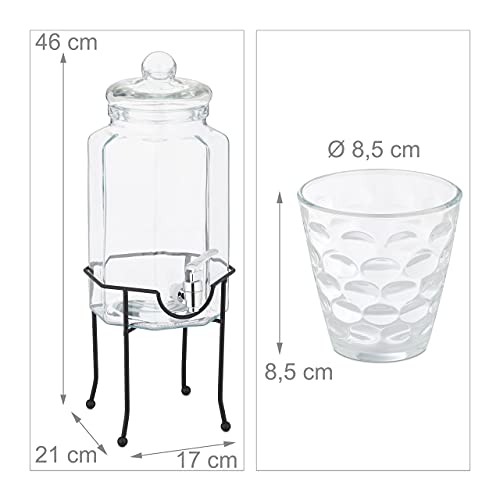 Relaxdays Dispenser per Bevande, 3,8 Litri, 4 Bicchieri Vetro, Caraffa per Acqua con Rubinetto e Supporto, Trasparente, 80% Ferro 10% plastica, 1 pz