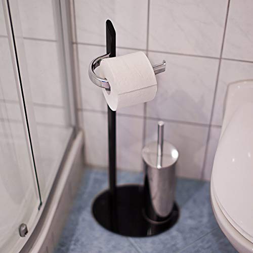 Relaxdays Set WC Klaas portarotolo e portascopino in Vetro Nero e Ferro Cromato HxLxP: 70x28x20 cm Colore Argento e Nero