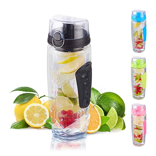 Relaxdays, Nero Bottiglia con Infusore per la Frutta, Senza BPA, Chiusura Ermetica, 900ml, Detox Acqua Infusa, Coperchio, plastica, Tessuto, 25 x 8,5 x 8,5 cm