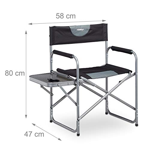 Relaxdays, Nero Sedia Regista, Pieghevole da Campeggio e Giardino, Festival & Pesca, Tavolino Porta Bevande, acciaio, PE