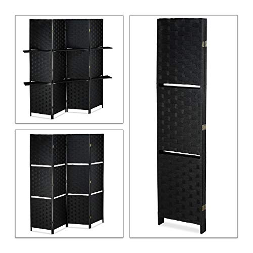 Relaxdays Paravento a 4 Ante, Divisore Interno, Pieghevole, con 2 Ripiani, in Carta, HxLxP: 180 x 170 x 39 cm ca., Nero