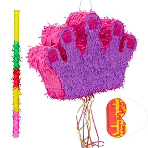 Relaxdays Pinata - Set di 3 corone con asta e maschera per gli occhi, per bambini e compleanni, da riempire autonomamente, con pignatta