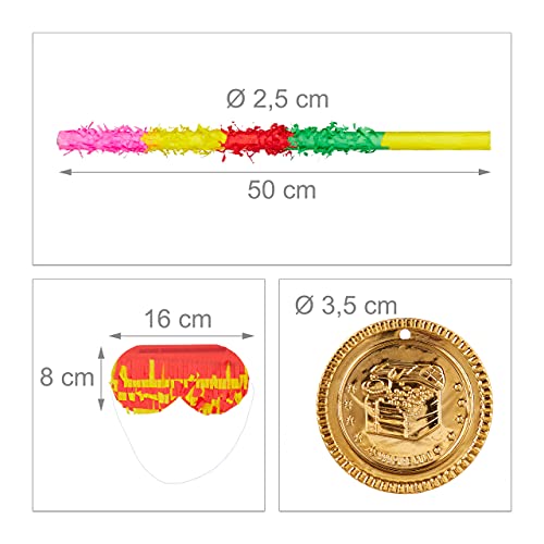 Relaxdays 291 TLG. Pinata Set di teschio, Pinatastab & Benda per occhi, 288 Goldtaler, Piñata, bacchetta con maschera per gli occhi, giorno dei morti, multicolore