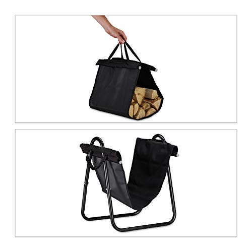 Relaxdays Portalegna con Borsa da Trasporto, Cestino Grande da Camino per i Ciocchi di Legna, Acciaio & Poliestere, Nero