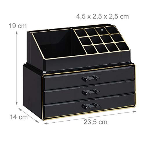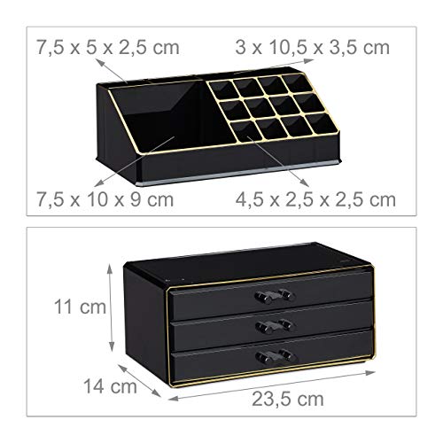 Relaxdays Portatrucchi, 2 Organizer Combinabili, Portaoggetti per Cosmetici con Cassetti, Multiuso, Versatile, Nero/Oro, 1 pz