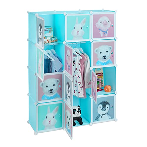 Relaxdays Scaffale Componibile da Cameretta, 2 Aste Appendiabiti, Disegni Animali, HxLxP: 145x109x37 cm, Incastro, Blu, 80% plastica 20% Ferro