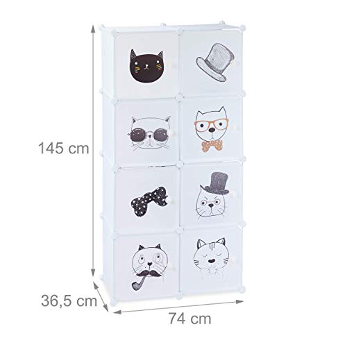 Relaxdays Scaffale Componibile per Cameretta dei Bambini, con Gatti, 7 Scomparti Armadietto HLP: 145x74x36,5 cm, Bianco