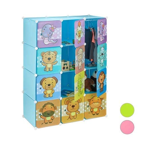 Relaxdays Scaffale Componibile per la Cameretta dei Bambini, Immagini Graziose di Animali, Ante e Bastone Appendiabiti, Blu