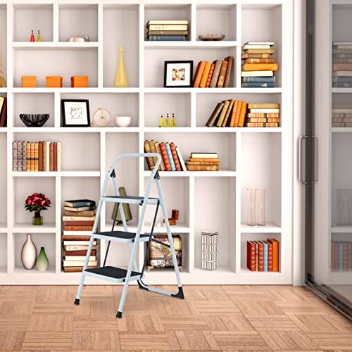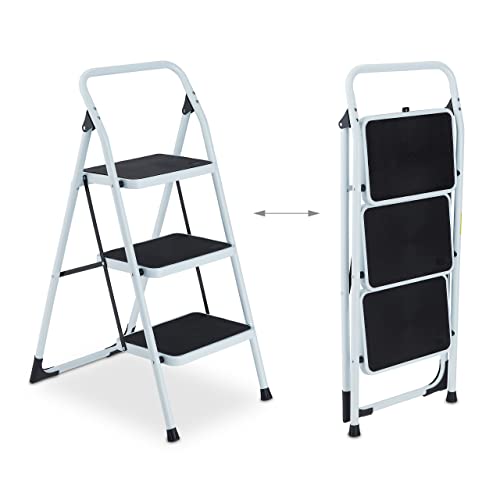 Relaxdays Scaletta Pieghevole, Uso Domestico, Scala Piccola a 3 Gradini, Fino a 150 kg, Antiscivolo, in Acciaio, Bianco, 70% 30% plastica, 1 pz
