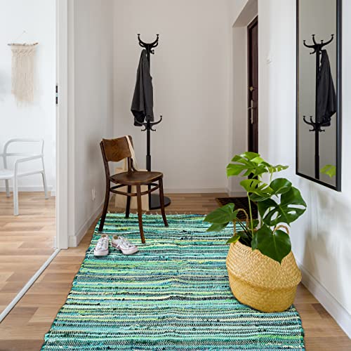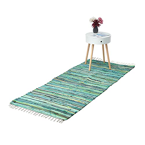 Relaxdays Tappeto Etnico, Cotone Intrecciato, 80x200 cm, Passatoia Antiscivolo, Guida con Frange, a Mano, Tonalità Verdi
