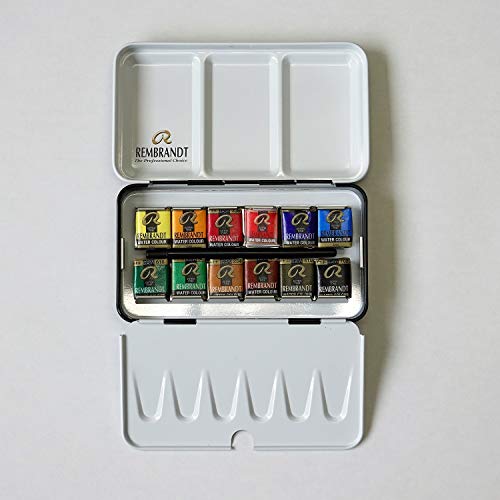 Rembrandt Water Colour Box - Colore ad acquerello extra fine Mono PIGMENTED, scatola di metallo con 12 ciotole, colori monopigmento, pennello incluso