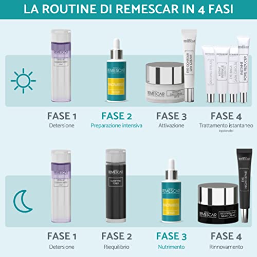 ★ PREPARAZIONE DELLA PELLE - Per ottenere risultati migliori con i nostri prodotti Remescar Instant, è importante detergere e preparare a pelle. Per questo motivo abbiamo sviluppato per te una routine di bellezza completa: abbiamo ideato due routine, una giornaliera per idratare la pelle e proteggerla dagli agenti esterni, e una serale che va a riparare e rigenerare la pelle mentre dormi.