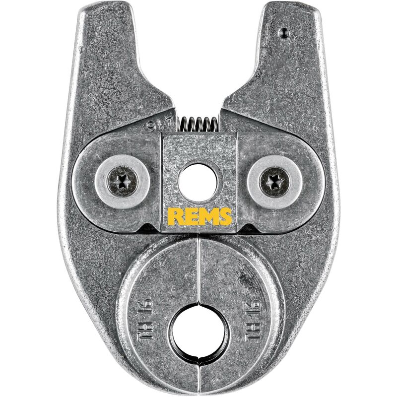 Pinza a pressare Mini TH 16 Rems 578352 R Pinza a pressare REMS Mini (PZ-2B) con 2 ganasce monoblocco orientabili. Forma particolarmente compatta e basso peso delle pinze a pressare REMS Mini grazie alla particolare disposizione del loro attacco (brevetto EP 1 952 948). Le piastrine di fissaggio delle pinze si trovano all'interno di incavi ricavati sulle ganasce che garantiscono una pressatura della pinza perfettamente in asse (brevetto EP 2 347 862). Le pinze a pressare REMS Mini ACz, Fz, HEz, RFz, RFIz con dentatura impediscono la formazione di bave sul manicotto a pressare (brevetto EP 2 027 971). Pinze a pressare di resistenza molto elevata in acciaio speciale forgiato ed a tempra speciale. I contorni di pressatura delle pinze a pressare REMS/anelli a pressare sono specifici al sistema e sono conformi ai contorni di pressatura dei sistemi pressfitting relativi. Si ottiene quindi una pressatura sicura e perfettamente conforme al sistema. Contorni di pressatura delle ganasce delle
