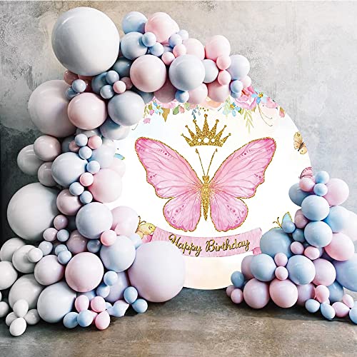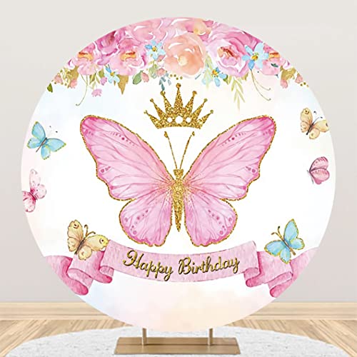 Renaiss 2m Buon compleanno farfalla fondale rotondo rosa floreale oro Poliestere Fotografia Sfondo Baby Shower Ragazza Compleanno Festa Decorazione Torta Tabella Banner Foto Studio Puntelli