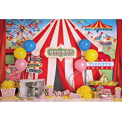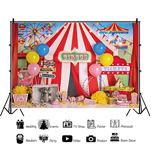 Renaiss 2.7x1.8m Circo Fotografia Sfondo Rosso Strisce Bianche Tenda Palloncino Carosello Sfondo Notte di Carnevale Kid Boy Girl Birthday Party Decoration Studio Puntelli