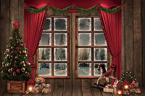 Renaiss 3x2.5m Sfondo di Natale per interni Finestra in legno Neve Albero di Natale Regalo Sfondo per la fotografia Festa Banner Famiglia Kid Ritratto Shooting Studio Puntelli
