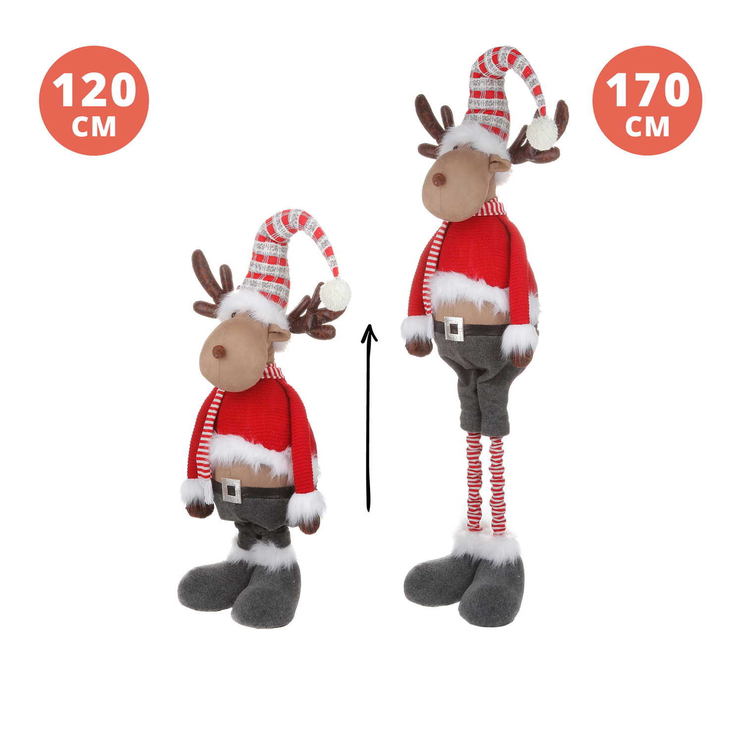 Buffo complemento d'arredo per decorare la casa durante il periodo natalizio, questa tenera renna è caratterizzata da lunghe gambe estensibili che le permettono di raggiungere un'altezza di ben 170 cm! Sarà una simpatica decorazione che conquisterà soprattutto i più piccoli, aggiungendo un magico tocco natalizio alla stanza in cui verrà collocata.