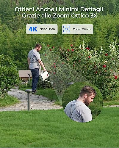 4K HD E VISIONE NOTTURNA A COLORI: questa videocamera sorveglianza esterno fornisce immagini a colori di alta qualità in 4K HD anche di notte, mentre la distanza della sua visione notturna a infrarossi può arrivare fino a 30 m. Con lo zoom ottico 3X, puoi ingrandire per visualizzare dettagli sorprendenti o rimpicciolire per la massima copertura.