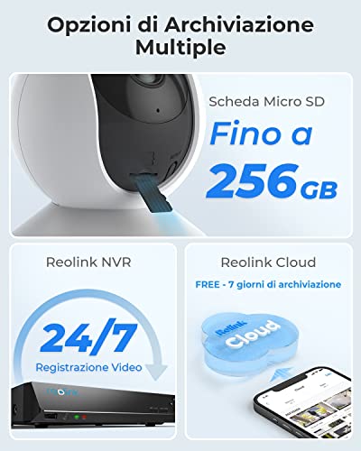 Opzioni di Archiviazione Flessibili: I video possono essere salvati sulla scheda micro SD (fino a 256 GB, non inclusa) e sul NVR Reolink, oppure caricati su Reolink Cloud.