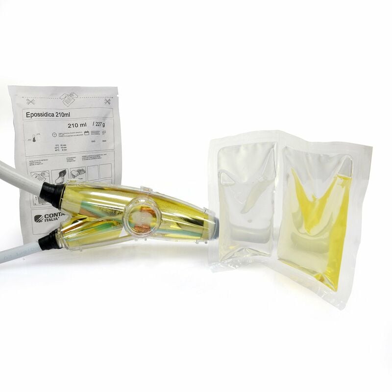 La resina epossidica viene utilizzata per l'isolamento, la sigillatura e la protezione meccanica dei cavi di bassa tensione in condizioni di posa permanente, direttamente interrata (impianti di illuminazione) o completamente sommersa (pompe sommerse ad alta pressione). La resina epossidica ha eccellenti proprietà dielettriche, elevata resistenza alle alte temperature, ritiro lineare basso, elevata resistenza meccanica, eccellente adesione a tutte le tipologie di cavi in plastica, elevata stabilità termica, tempi di stoccaggio fino a 42 mesi, eccellente resistenza idrolitica, possibilità di controllare la connessione grazie alla trasparenza del prodotto. CARATTERISTICHE DI LAVORAZIONE Rapporto di miscelazione A:B: 100:65 Pot life a 23 °C: 18 min Gel time a 23 °C: 20 min