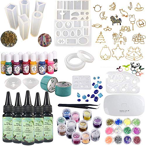 Kit resina UV trasparente con coloranti e 12 stampi per fare pendenti Orecchini Anelli Braccialetti Diamanti Pezzi di gioielli + 58 Decorazioni Fiori scintillanti brillanti + Lampada portatile