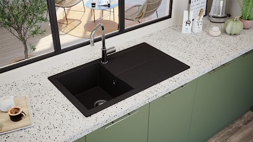 Alta qualità: il lavello in mineralite è un complemento perfetto per la cucina con un lavello e un grande scolapiatti. Con una dimensione di 86 x 50 cm, il lavello nero da incasso si integra in modo ottimale