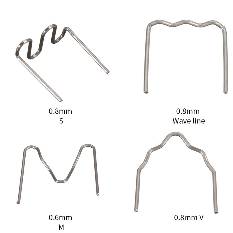 Caratteristiche: Realizzato in acciaio inossidabile di alta qualità, pre-tagliati per più lavoro facile. 4 tipi disponibili, e pacchetto differente, si prega di scegliere. Può essere utilizzato per qualsiasi tipo di plastica riparazione / saldatura, cioè nylon, PVC, ABS, etc. Hot Cucitrici di alta qualità per la saldatura di plastica, auto paraurti Riparazione E 'costituito da acciaio inox 304, pre-tagliati. Specifica: Stile: 100X 0,8 millimetri S graffette, 100X 0.8mm graffette linea d'onda, M graffette 100X 0.6mm, graffette 100X 0.8mm V Diametro Staple: 0,6 millimetri, 0,8 millimetri Staple Larghezza: 15-16.5mm Saluto Altezza: 15mm Formato del pacchetto: 8,0 cm * 6,0 cm * 2,0 cm Peso del pacchetto: 120g Lista del pacchetto: Staples 400X