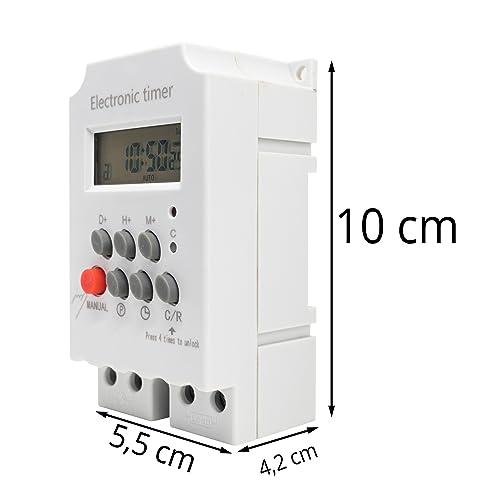 Ampia gamma di applicazioni: il timer digitale per guida DIN è la soluzione ideale per molti elettrodomestici che devono essere accesi e spenti regolarmente, ad esempio ad esempio attrezzature agricole, scarico e essiccazione dei magazzini e apparecchiature televisive e pubblicitarie. Inoltre, è perfetto per ispezionare vari oggetti come lampioni, insegne al neon, cartelli pubblicitari e impianti di produzione.